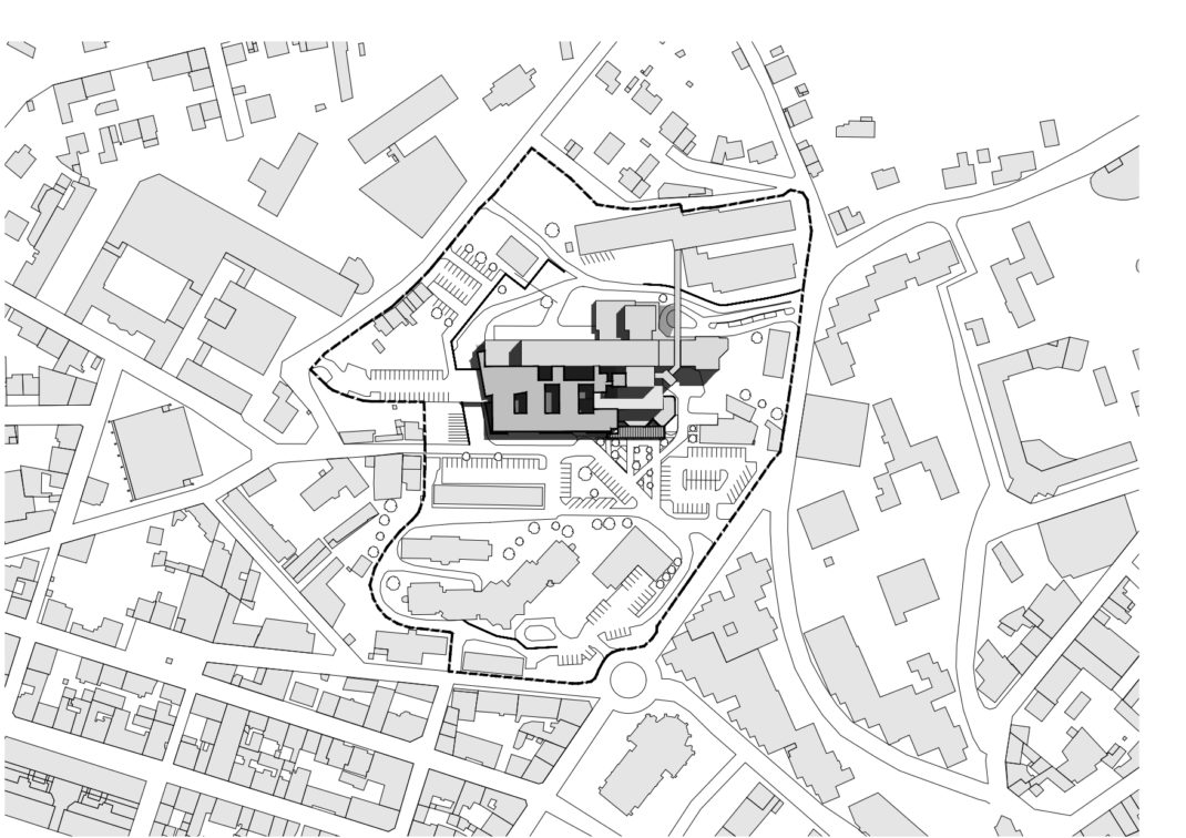 Hétéroclite dans son architecture, l’hôpital de Firminy comprend une dizaine de bâtiments, dont la barre du bâtiment C, construite dans les années 1957 – 62 et remaniée au gré d’ajouts successifs. L’excavation de la butte sur laquelle elle est implantée a permis de venir adosser le nouveau bâtiment des Urgences au mur de ses fondations, lesquelles ont été reprises et consolidées. La barre, traitée comme un fond de scène, se voit ainsi flanquée d’un bâtiment socle qui la ré-ancre dans le sol et dont la toiture végétalisée agrémente la vue depuis les étages supérieurs. Cette vaste opération de remodelage topographique a été élargie à l’aire environnante dans une perspective de rationalisation de la desserte de l’hôpital, ayant donné lieu à l’aménagement de rampes, de plateformes et de parkings.